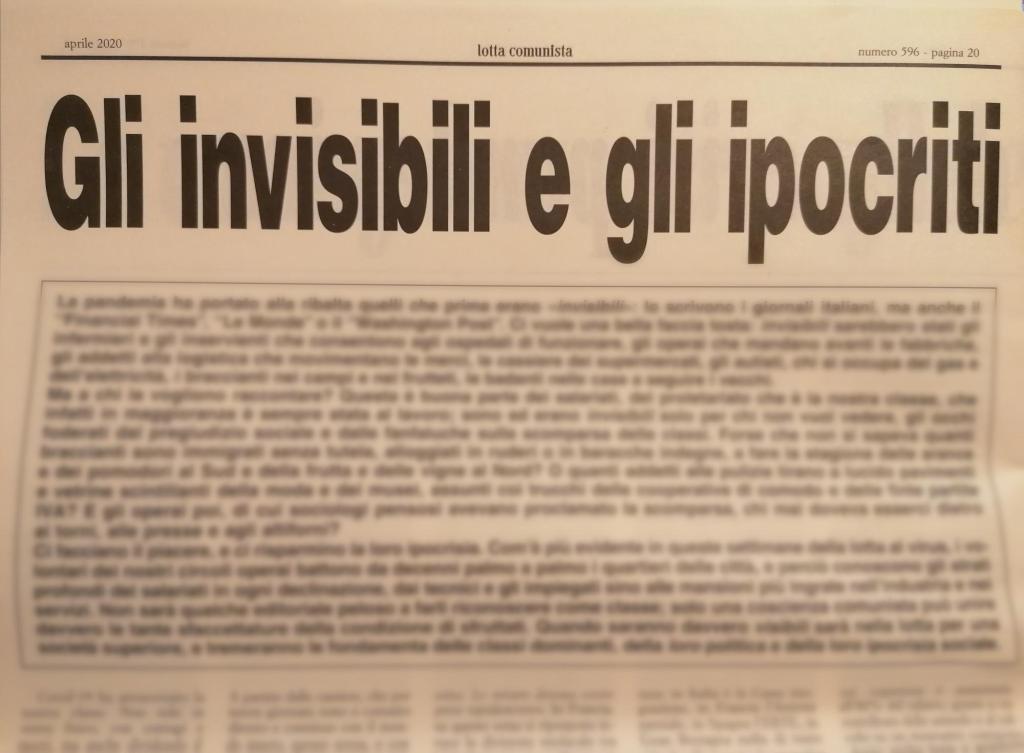 Dopo circa un mese dalla pubblicazione online del nostro articolo su “Lotta comunista: Soccorso rosso o solidarismo interclassista?” il numero di maggio 2020 di Lotta comunista ha pubblicato un articolo in doppia pagina dall’altisonante titolo “I compiti dei leninisti nella crisi della pandemia secolare”.