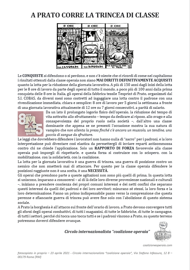 A PRATO CORRE LA TRINCEA DI CLASSE – volantino di solidarietà con gli operai della Texprint di Prato – 24 aprile 2021