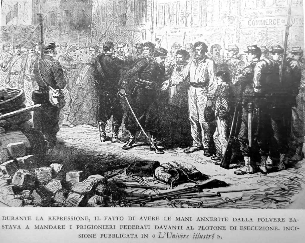 Per le strade di Parigi si uccise come in un immenso mattatoio, combattenti, sospetti, vittime di delazione da parte di “onesti cittadini amanti dell’ordine”, anziani, donne, ragazzi, vengono massacrati a colpi di pallottole, calcio di fucile, baionette, bastonate. Chi riesce a nascondersi nelle fogne viene inseguito con cani e torce, macabra anticipazione della repressione nazista della rivolta del ghetto di Varsavia del 1943. I prigionieri vengono passati per le armi per i più fantasiosi motivi: per i loro capelli bianchi, per gli abiti, per le mani callose o per uno sguardo troppo fiero.