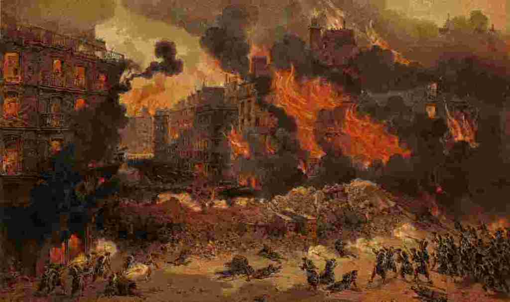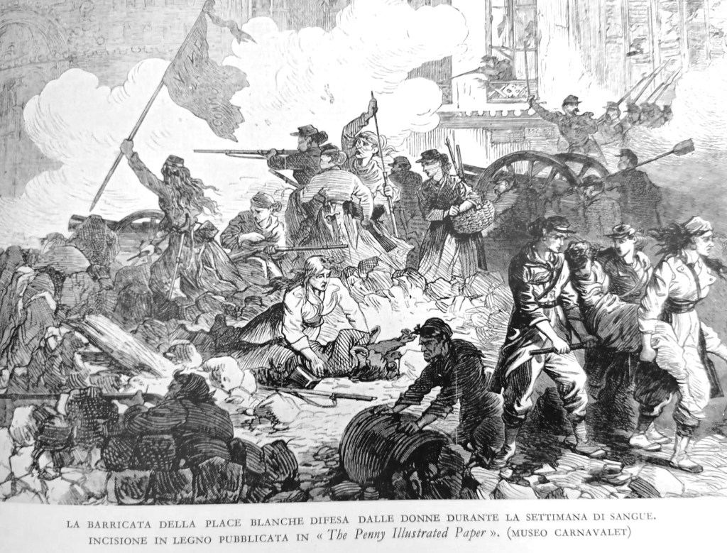 Dopo gli incendi scoppiati nel corso delle operazioni militari, appiccati da entrambi gli schieramenti, ogni donna con un lumino viene fucilata in quanto “incendiaria”, ma si sa, ancora oggi la distruzione di un monumento o di una cattedrale suscita più commozione della vita di migliaia di esseri umani che annegano nel mediterraneo. I sopravvissuti vengono riempiti di calci, pugni e sputi dalla soldataglia e dai “cittadini per bene”, tutta la borghesia si libera del panico accumulato nei giorni del governo degli operai scaricandolo vigliaccamente e furiosamente su vittime inermi costrette a passare le forche caudine prima di essere gettate in luridi sotterranei.