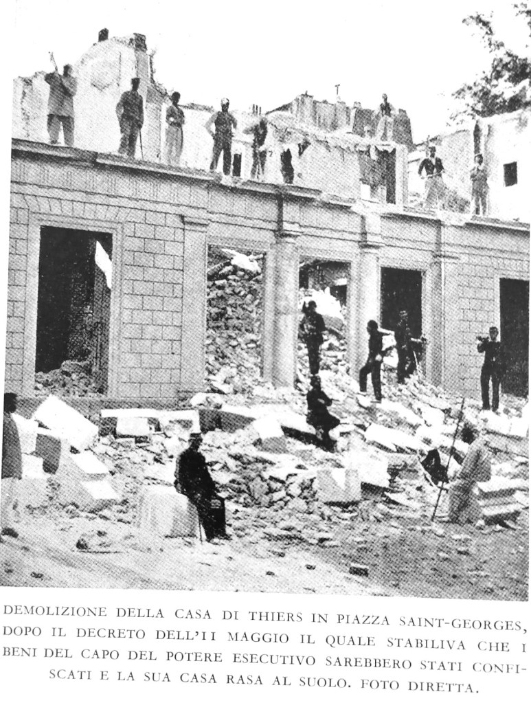 Durante la settimana di sangue, Thiers dichiarò apertamente l’inammissibilità del soccorso ai feriti della Comune, in quanto, trattandosi di un governo illegale non poteva ad esso applicarsi la convenzione di Ginevra. Probabilmente la distruzione ad opera dei comunardi della sua villa, costruita con i proventi della sua ambigua carriera accademica e politica, dovette inasprirlo, se possibile.