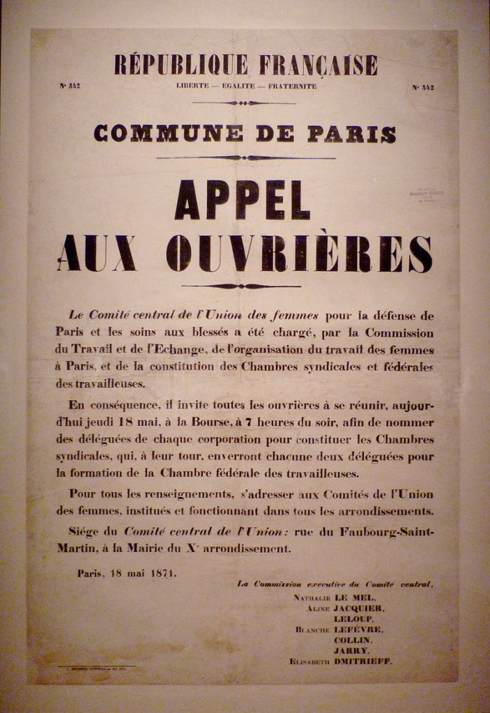 È singolare che molti di coloro che oggi pongono la questione di genere come parallela, se non prioritaria, rispetto alla questione di classe – con saggi di pessima prosa che purtroppo dobbiamo ancora rassegnarci a vedere nelle pubblicazioni pseudo-rivoluzionarie – pur richiamandosi formalmente anch’essi all’esperienza parigina, non si siano accorti o abbiano preferito tacere circa l’esclusione delle donne dal suffragio universale proclamato dalla Comune del 1871.