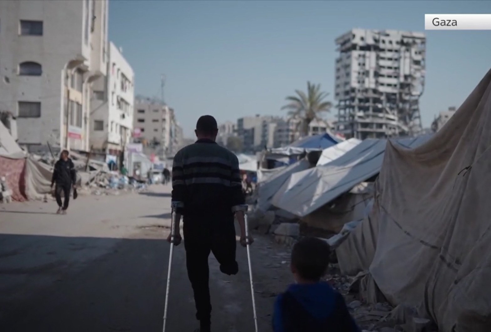 Mohammed ha subito l’amputazione della gamba destra (facilmente evitabile con cure mediche adeguate, ma il controllo israeliano dei valichi condanna alla morte o all’invalidità migliaia di palestinesi, bambini compresi) e ora deve affrontare il problema della fame. Si reca al mercato accompagnato dal figlio bambino a cui dice «andiamo, prendi per mano le stampelle».