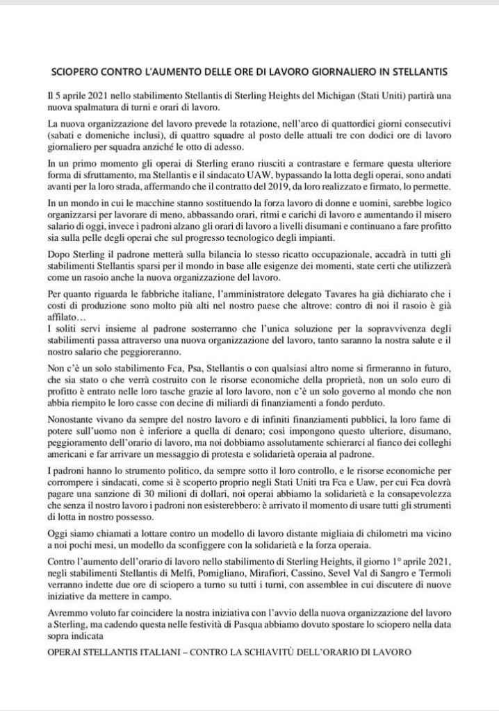 VOLANTINO DI SOLIDARIETA’ AGLI OPERAI STELLANTIS USA DA PARTE DEGLI OPERAI STELLANTIS IN ITALIA (08/03/2021)
